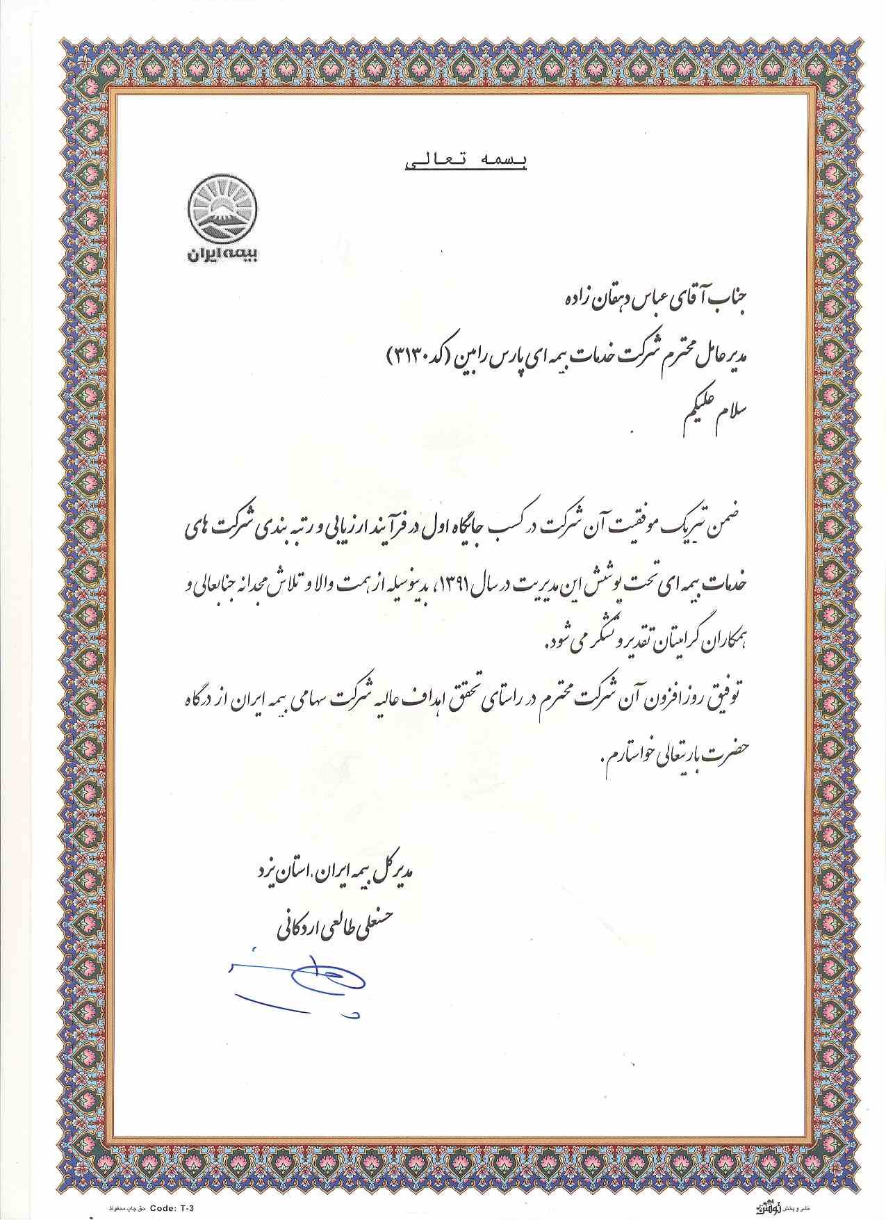 شرکت خدمات بیمه ای پارس رابین با یش از 20 سال سابقه با هدف خدمات متمایز بیمه ای فعالیت میکند و از نظر طبقه بندی این شرکت دارای گرید درجه یک می باشد و طی سالهای فعالیت خود رتبه های برتر اول تا چهارم را در استان کسب نموده است .